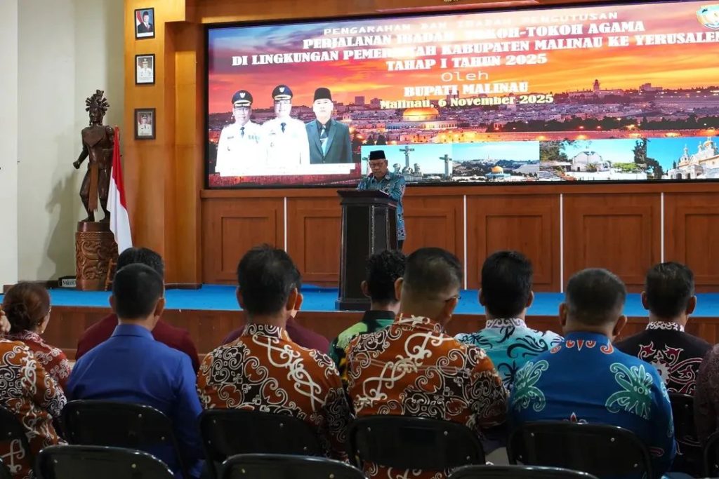 MALINAU – Pemerintah Kabupaten Malinau melalui Badan Musyawarah Antar Gereja (BAMAG) resmi melepas rombongan perjalanan ibadah tokoh-tokoh agama Kabupaten Malinau Tahun 2025. Acara berlangsung di Ruang Laga Feratu, Kantor Bupati Malinau, Kamis (6/11/2025), dan dipimpin langsung oleh Wakil Bupati Malinau, Jakaria, S.E., M.Si.
