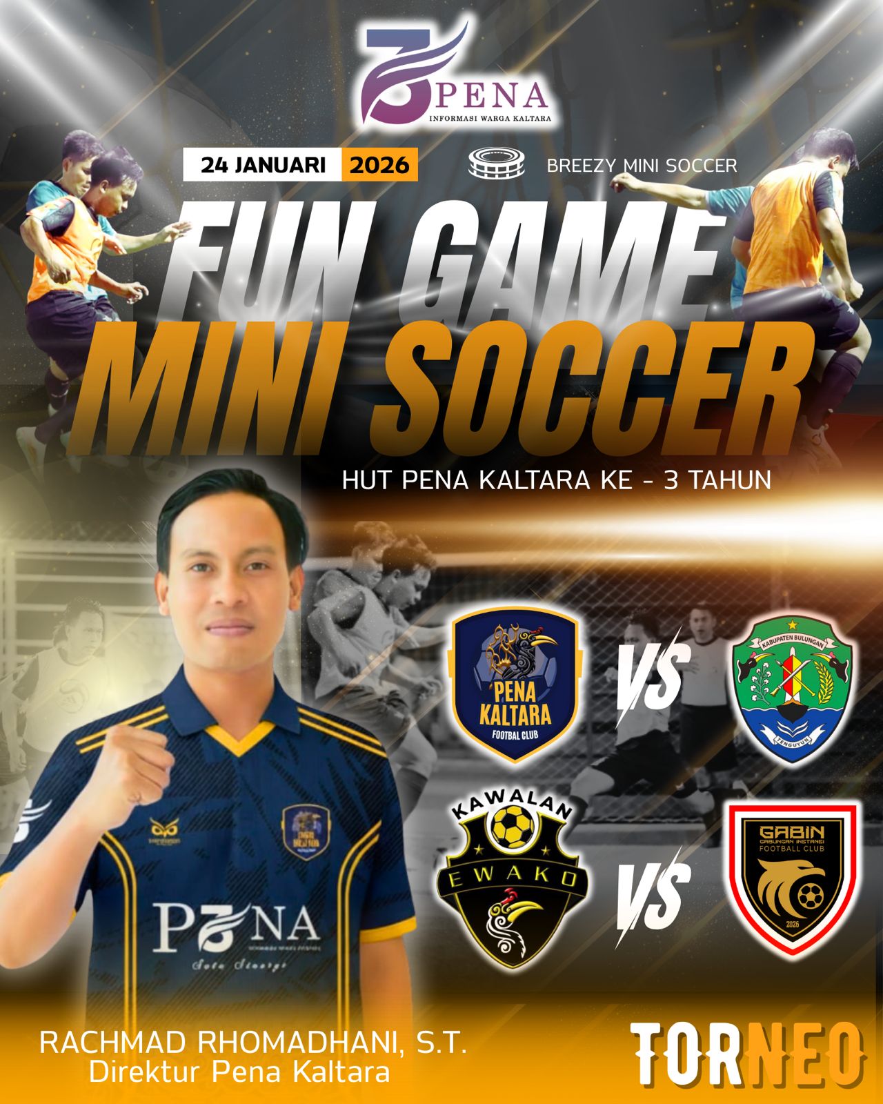 Direktur Utama Pena Kaltara, Rachmad Rhomadhani, S.T, mengatakan bahwa Fun Games Mini Soccer Torneo ini diikuti oleh empat tim yang berasal dari berbagai latar belakang instansi dan komunitas.