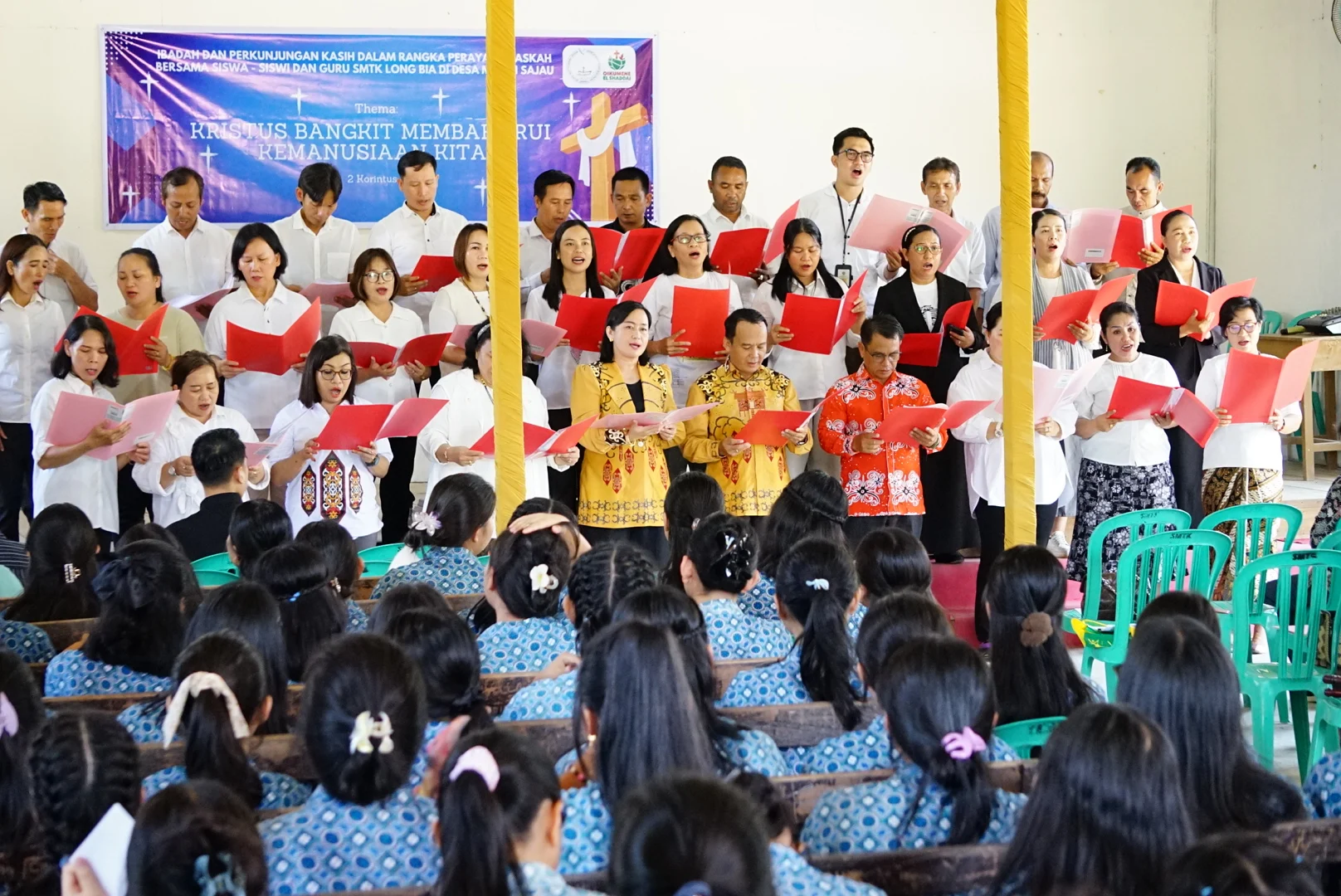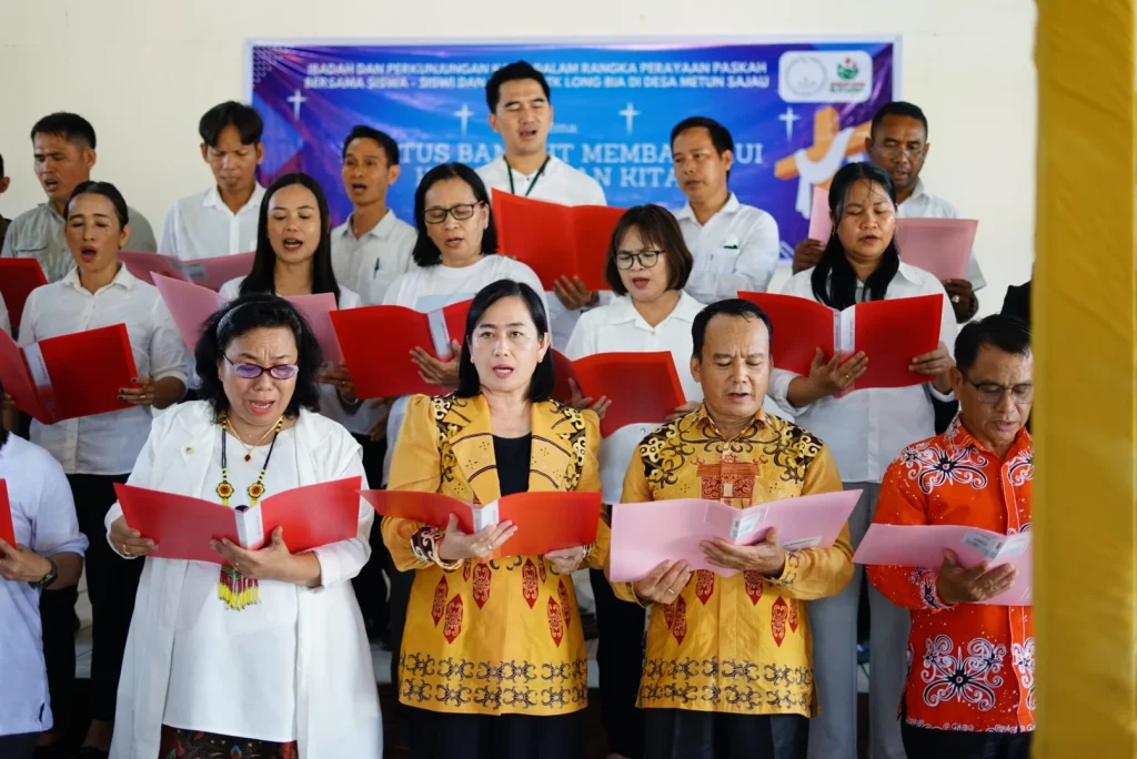 SAJAU – Suasana penuh sukacita dan kebersamaan mewarnai ibadah dan kunjungan kasih dalam rangka perayaan Paskah bersama siswa-siswi serta guru Sekolah Menengah Teologi Kristen (SMTK) Long Bia di Desa Metun Sajau, Jumat (24/4/2026). Mengusung tema “Kristus Bangkit Membaharui Kemanusiaan Kita” (2 Korintus 5:7), kegiatan ini menjadi momentum penguatan iman sekaligus wujud nyata kepedulian pemerintah daerah.