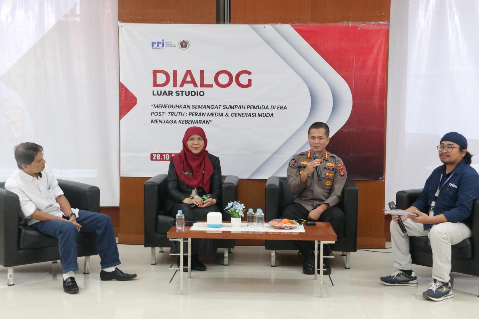 TARAKAN — Kepala Bidang Hubungan Masyarakat Polda Kalimantan Utara, Kombes Pol. Budi Rachmat, S.I.K., M.Si., menghadiri acara siaran langsung Dialog Luar Studio bertema “Meneguhkan Semangat Sumpah Pemuda di Era Post-Truth: Peran Media dan Generasi Muda Penjaga Kebenaran” yang diselenggarakan oleh RRI Tarakan, bertempat di Aula Universitas Terbuka Tarakan, Selasa (28/10/2025).